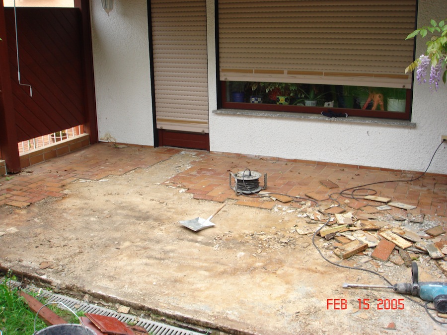 Bauobjekt & Zustand: geflieste Terrasse 25 qm, undicht, größtenteils hohle Fliesen, poröser und gerissener Estrich