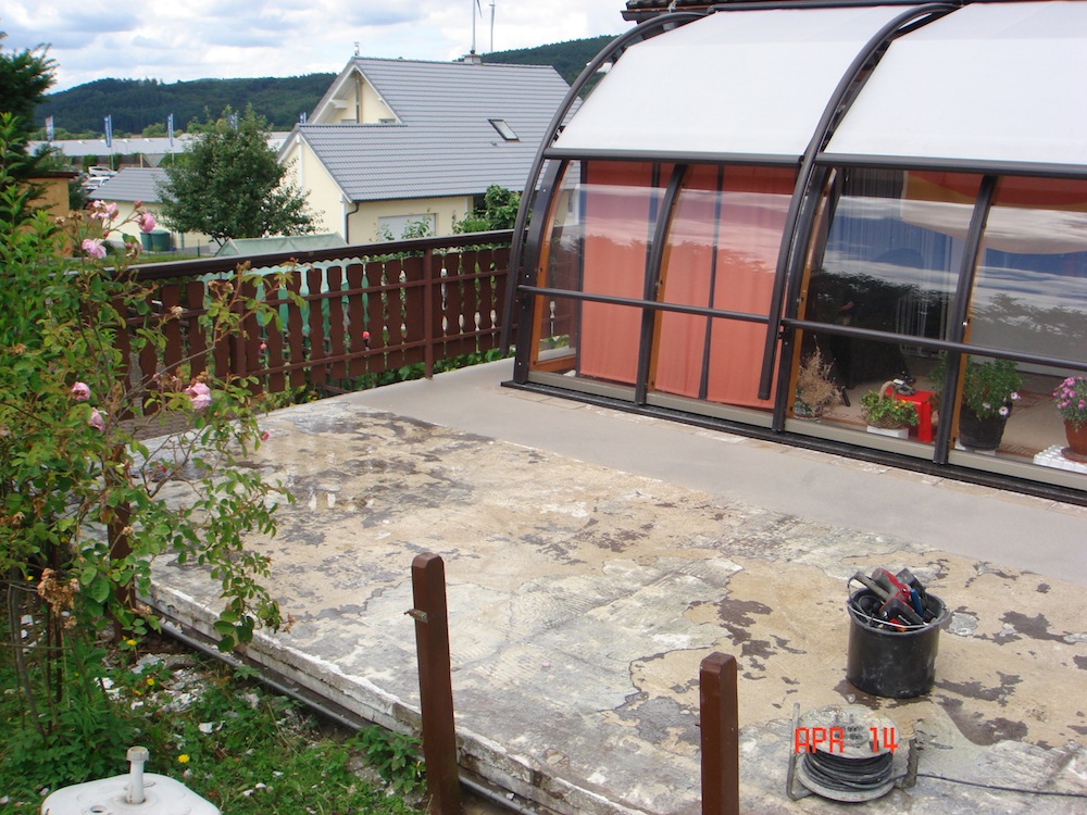 Bauobjekt & Zustand: geflieste Terrasse mit Wintergarten 70 qm, undicht, größtenteils hohle Fliesen, poröser Estrich